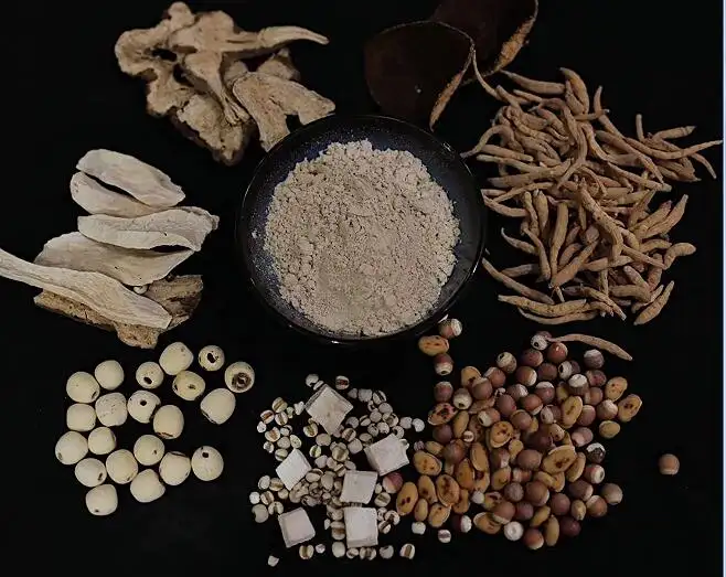 制作八珍粉的原材料里,有几味药是补脾阳的,像人参、白术、茯苓,但中医讲究的是从阴中生阳,所以方子里面还配了补脾阴的药物,比如山药、莲子肉、薏苡仁、白扁豆、芡实,以平衡阴阳。